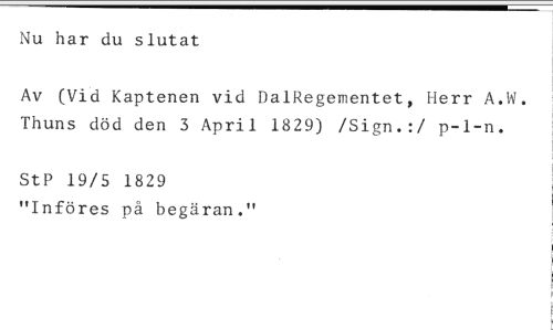 Nu har du slutat //// Av (Vid Kaptenen vid DalRegementet, Herr A.W. Thuns död den 3 April 1829) /Sign.:/ p-1-n. //// StP 19/5 1829 //// "Införes pä begäran."