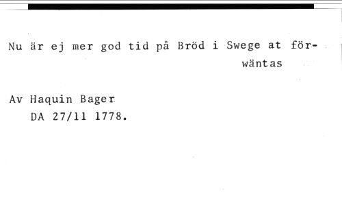 Nu är ej mer god tid på Bröd i Swege at för- //// wänt as //// Av Haquin Bager. DA 27/11 1778.