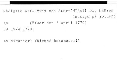 Nådigste Arf-Prins och Stor-AMIRAl! Dig HERren //// ledsage på jorden! //// Av (Öfwer den 2 April 1770) //// DA 19/4 1770. //// Av Nicander? (Rimmad hexameter!)