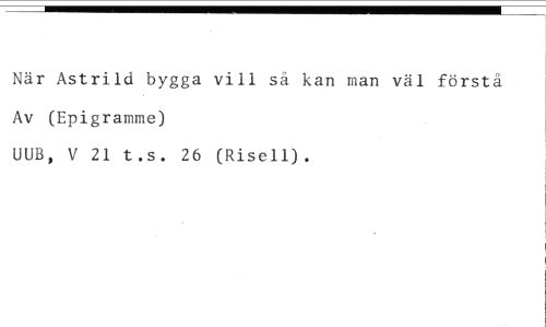När Astrild bygga vill så kan man väl förstå //// Av (Epigramme) //// UUB, V 21 t.s. 26 (Risell).