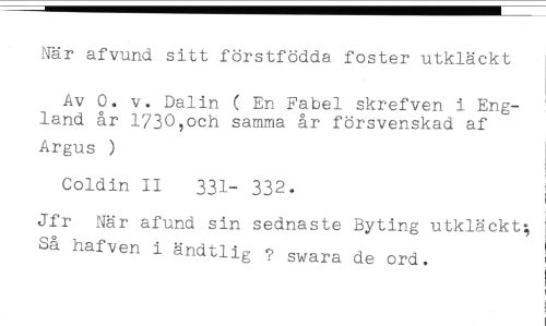 När afvund sitt förstfödda foster utkläckt //// Av 0. v. Dalin ( En Fabel skrefven i England år 1730loch samma år försvenskad af //// Argus ) //// Coldin II 331- 332. //// Jfr När afund sin sednaste Byting utkläckt; Så hafven i ändtlig ? swara de ord.