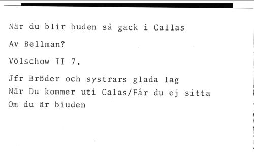 När du blir buden så gack i Callas Av Bellman? //// Völschow II 7. //// Jfr Bröder och systrars glada lag //// När Du kommer uti Calas/Får du ej sitta Om du är biuden