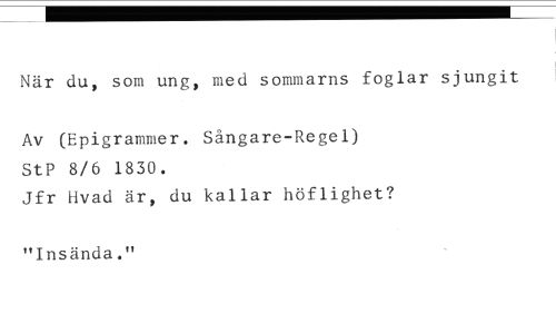 När du, som ung, med sommarns foglar sjungit Av (Epigrammer. Sångare-Regel) //// StP 8/6 1830. //// Jfr livad är, du kallar höflighet? //// "Insända."