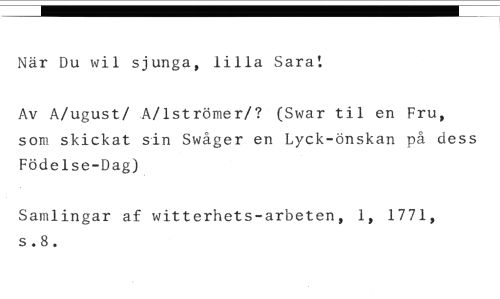 När Du wil sjunga, lilla Sara! //// Av A/ugust/ A/lströmer/? (Swar til en Fru, som skickat sin Swåger en Lyck-önskan på dess Födelse-Dag) //// Samlingar af witterhets-arbeten, 1, 1771, s•8.
