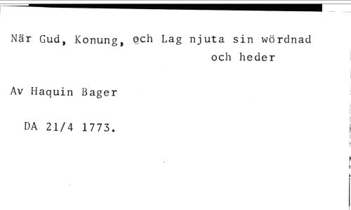 När Gud, Konung, och Lag njuta sin wördnad //// och heder //// Av Haquin Bager //// DA 21/4 1773.