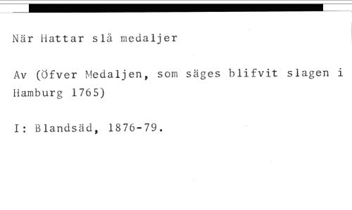När hattar slå medaljer //// Av (Öfver Medaljen, som säges blivit slagen i Hamburg 1765) //// I: Blandsäd, 1876-79.