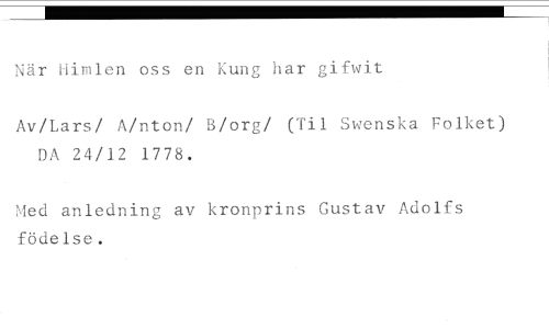 När Himlen oss en Kung har gifwit //// Av/Lars/ A/nton/ B/org/ (Til Swenska Folket) DA 24/12 1778. //// Med anledning av kronprins Gustav Adolfs födelse.