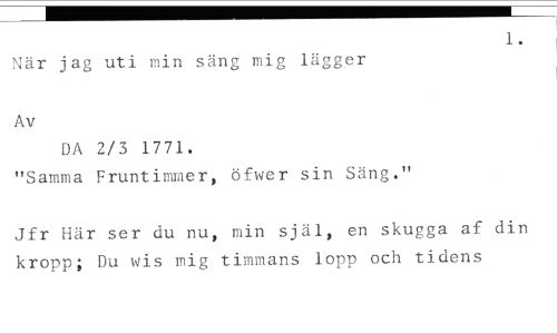 1. //// När jag uti min säng mig lägger //// Av //// DA 2/3 1771. //// "Samma Fruntimmer, öfwer sin Säng." //// Jfr Här ser du nu, min själ, en skugga af din kropp; Du inis mig timmans lopp och tidens