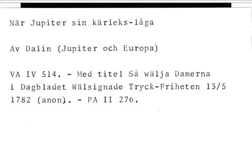 När Jupiter sin kärleks-låga //// Av Dalin (Jupiter och Europa) //// VA IV 514. - Med titel Så wälja Damerna i Dagbladet Wälsignade Tryck-Friheten 13/5 1782 (anon). - PA II 276'.
