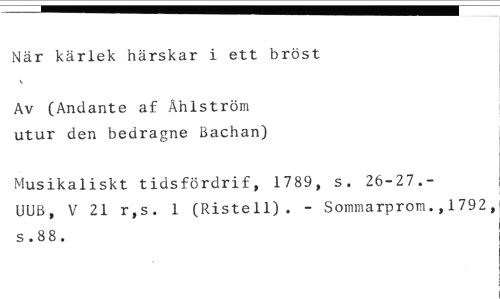 När kärlek härskar i ett bröst //// Av (Andante af Åhlström utur den bedragne Bachan) //// Musikaliskt tidsfördrif, 1789, s. 26-27.- //// UUB, V 21 r,s. 1 (Ristell). - Sommarprom.,1792, s.88.