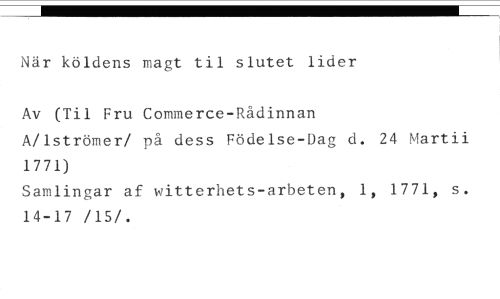 Når köldens magt til slutet lider //// Av (Til Fru Commerce-Rådinnan //// A/lströmer/ på dess Födelse-Dag d. 24 Martii 1771) //// Samlingar af witterhets-arbeten, 1, 1771, s. 14-17 /15/.