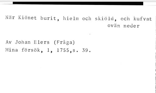 När Kiönet burit, hielm och skiöld, och kufvat //// ovän. neder //// Av Johan Elers (Fråga) //// Mina försök, 1, 1755,s. 39.