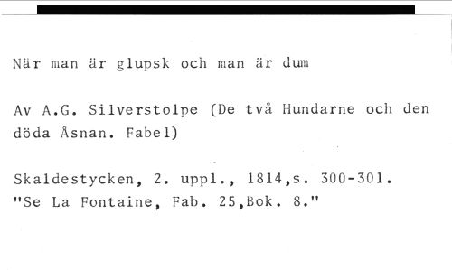 När man är glupsk och man är dum //// Av A.G. Silverstolpe (De två Hundarne och den döda Åsnan. Fabel) //// Skaldestycken, 2. uppl., 1814,s. 300-301. "Se La Fontaine, Fab. 25,Bok. 8."