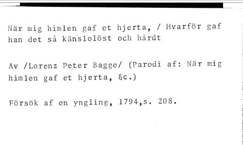 När mig himlen gaf et hjerta, / Hvarför gaf han det så känslolöst och hårdt //// Av /Lorenz Peter Bagge/ (Parodi af: När mig himlen gaf et hjerta, &c.) //// Försök af en yngling, 1794,s. 208.