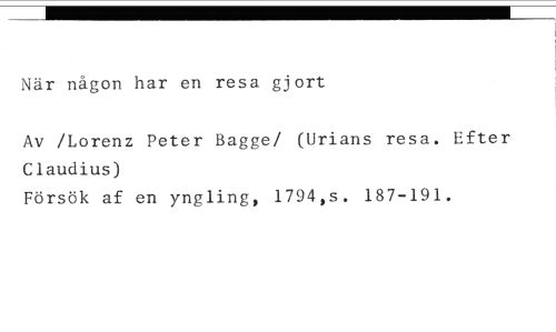 När någon har en resa gjort //// Av /Lorenz Peter Bagge/ (Urians resa. Efter Claudius) //// Försök af en yngling, 1794,s. 187-191.