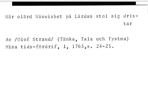 När olärd Näswishet på Lärdas stol sig dris- //// tar //// Av /Olof Strand/ (Tänka, Tala och Tystna) Mina tids-fördrif, 1, 1763,s. 24-25.