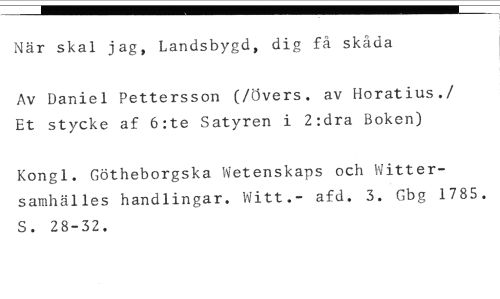 När skal jag, Landsbygd, dig få skåda //// Av Daniel Pettersson (/Övers. av Horatius./ Et stycke af 6:te Satyren i 2:dra Boken) //// Kongl. Götheborgska Wetenskaps och Wittersamhälles handlingar. Witt.- afd. 3. Gbg 1785. S. 28-32.