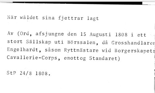 När wåldet sina fjettrar lagt //// Av (Ord, afsjungne den 15 Augusti 1808 i ett stort Sällskap uti Börssalen, då Grosshandlarer, Engelhardt, såsom Ryttmästare wid Borgerskapet Cavallerie-Corps, emottog Standaret) //// StP 24/8 1808.