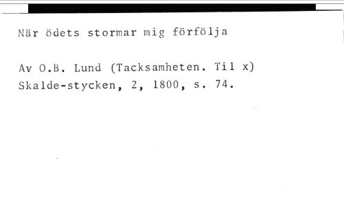 När ödets stormar mig förfölja //// Av O.B. Lund (Tacksamheten. Til x) Skalde-stycken, 2, 1800, s. 74.