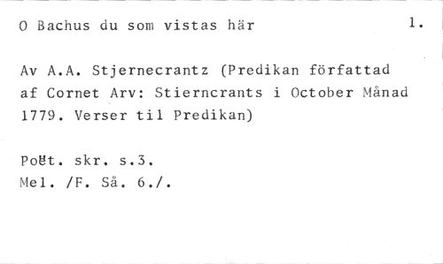 0 Bachus du som vistas här 1. //// Av A.A. Stjernecrantz (Predikan författad af Cornet Arv: Stierncrants i October Månad 1779. Verser til Predikan) //// Poet. skr. s.3. Mel. /F. Så. 6./.