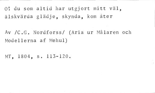 0! du som altid har utgjort mitt väl, älskvärda glädje, skynda, kom åter //// Av /C.G. Nordforss/ (Aria ur Målaren och Modellerna af Mehul) //// MT, 1804, s. 113-120.