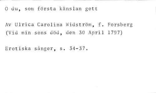 0 du, som första känslan gett //// Av Ulrica Carolina Widström, f. Forsberg (Vid min sons död, den 30 April 1797) //// Erotiska sånger, s. 34-37.