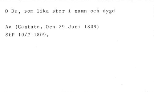 0 Du, som lika stor i namn och dygd //// Av (Cantate. Den 29 Juni 1809) StP 10/7 1809.