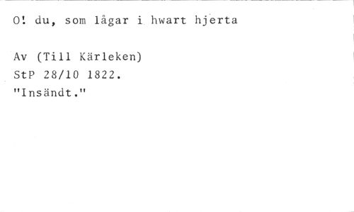 0! du, som lågar i hwart hjerta //// Av (Till Kärleken) StP 28/10 1822. "Insändt."