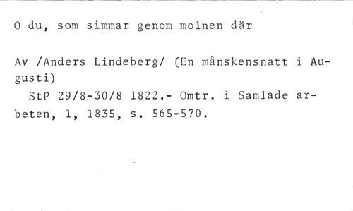 0 du, som simmar genom molnen där //// Av /Anders Lindeberg/ (En månskensnatt i Augusti) //// StP 29/8-30/8 1822.- Omtr. i Samlade arbeten, 1, 1835, s. 565-570.