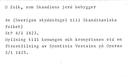 0 folk, som Skandiens jord bebygger //// Av (Sweriges skyddsängel till Skandinaviska folket) //// StP 8/1 1823. //// Hyllning till konungen och kronprinsen vid en föreställning av Spontinis Vestalen på Operan 5/1 1823.