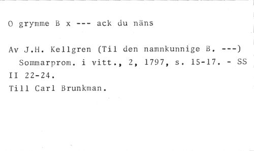 0 grymme B x --- ack du näns //// Av J.H. Kellgren (Til den namnkunnige B. ---) Sommarprom. i vitt., 2, 1797, s. 15-17. - SS II 22-24. //// Till Carl Brunkman.