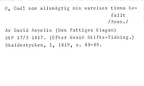 0, Gud! som allsmägtig min warelses timma be- //// fallt //// /Anon. //// /Av David Aspelin (Den Fattiges Klagan) //// StP 17/3 1817. (Efter Wexiö Stifts-Tidning.) Skaldestycken, 1, 1819, s. 88-89.