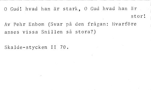 0 Gud! hvad han är stark, 0 Gud hvad han är //// stor: //// Av Pehr Enbom (Svar på den frågan: Hvarföre anses vissa Snillen så stora?) //// Skalde-stycken II 70.
