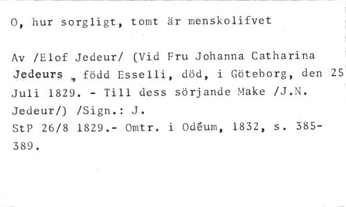 0, hur sorgligt, tomt är menskolifvet //// Av /Elof Jedeur/ (Vid Fru Johanna Catharina //// Jedeurs född Esselli, död, i Göteborg, den 25 //// Juli 1829. - Till dess sörjande Make /J.N. Jedeur/) /Sign.: J. //// StP 26/8 1829.- Omtr. i °deum, 1832, s. 385389.