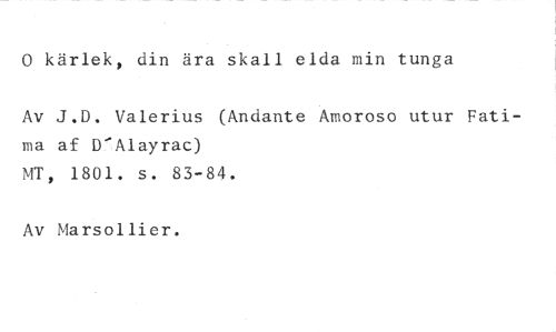 0 kärlek, din ära skall elda min tunga //// Av J.D. Valerius (Andante Amoroso utur Fatima af D'Alayrac) //// MT, 1801. s. 83-84. //// Av Marsollier.