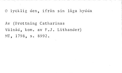 0 lycklig den, ifrån sin låga hydda //// Av (Drottning Catharinas Vålnad, kom. av F.J. Lithander) MT, 1798, s. 8992.