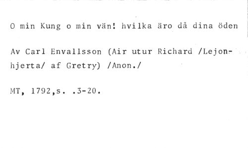 0 min Kung o min vän: hvilka äro då dina öden //// Av Carl Envallsson (Air utur Richard /Lejonlhjerta/ af Gretry) /Anon. //// /MT, 1792,s. .3-20.