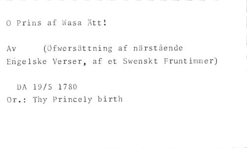0 Prins af Wasa Ätt! //// Av (Öfwersättning af närstående //// Engelske Verser, af et Swenskt Fruntimmer) //// DA 19/5 1780 //// Or.: Thy Princely birth