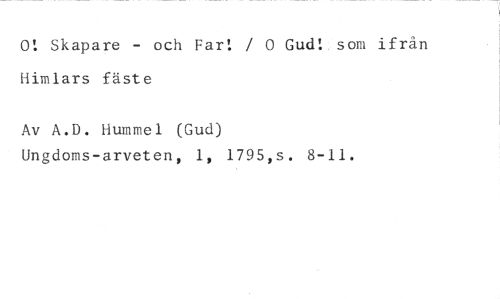 0: Skapare - och Far: / 0 Gud! som ifrån Himlars fäste //// Av A.D. Hummel (Gud) //// Ungdoms-arveten, 1, 1795,s. 8-11.