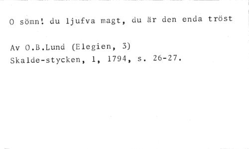 0 sömn: du ljufva magt, du är den enda tröst //// Av 0.B.Lund (Elegien, 3) //// Skalde-stycken, 1, 1794, s. 26-27.