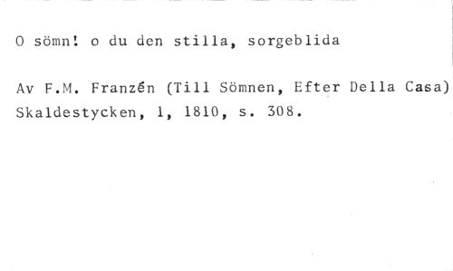 0 sömn: o du den stilla, sorgeblida //// Av F.M. Franzén (Till Sömnen, Efter Della Casa) Skaldestycken, 1, 1810, s. 308.