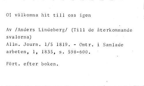 0! välkomna hit till oss igen //// Av /Anders Lindeberg/ (Till de svalorna) återkommande //// Allm. Journ. 1/5 1819. - Omtr. arbeten, 1, 1835, s. 598-600. i Samlade //// Fört. efter boken.