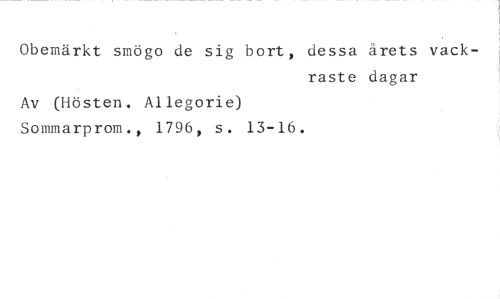 Obemärkt smögo de sig bort, dessa årets vack- //// raste dagar //// Av (Hösten. Allegorie) //// Sommarprom., 1796, s. 13-16.