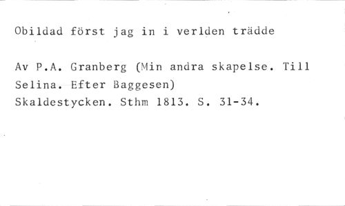 Obildad först jag in i verlden trädde //// Av P.A. Granberg (Min andra skapelse. Till Selina. Efter Baggesen) Skaldestycken. Sthm 1813. S. 31-34.