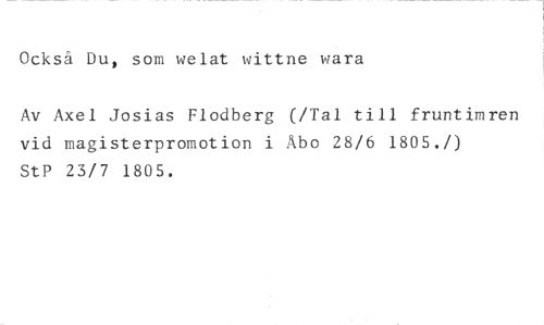 Också Du, som we lat wittne tara //// Av Axel Josias Flodberg (/Tal till fruntimren vid magisterpromotion i Åbo 28/6 1805./) StP 23/7 1805.