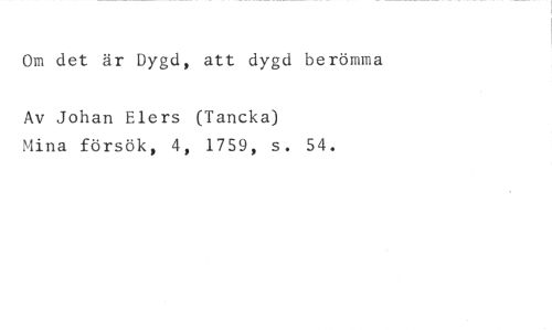 Om det är Dygd, att dygd berömma //// Av Johan Elers (Tancka) //// Mina försök, 4, 1759, s. 54.
