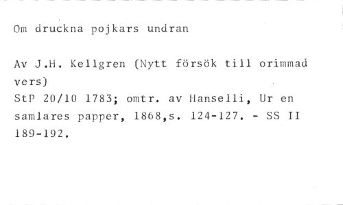 Om druckna pojkars undran //// Av J.H. Kellgren (Nytt försök till orimmad vers) //// StP 20/10 1783; omtr. av Uanselli, Ur en samlares papper, 1868,s. 124-127. - SS II 189-192.