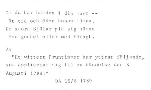 Om du har hämden i din magt -- //// At tid och öden honom lämna. De stora Själar plä sig hämna //// Med godhet eller med föragt. //// Av //// "Et wittert Fruntimmer har yttrat följande, som applicerar sig til en händelse den 8 //// Augusti 1789:" //// DA 15/8 1789