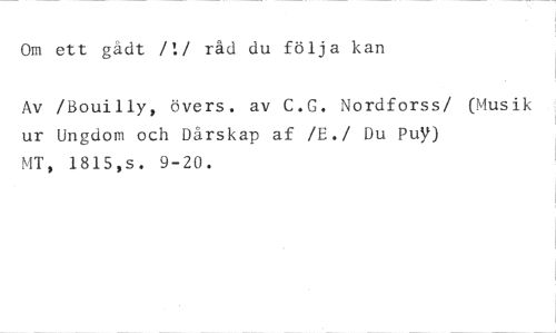 Om ett gådt fl/ råd du följa kan //// Av /Bouilly, övers. av C.G. Nordforss/ (Musik ur Ungdom och Dårskap af /E./ Du Pur) MT, 1815,s. 9-20.