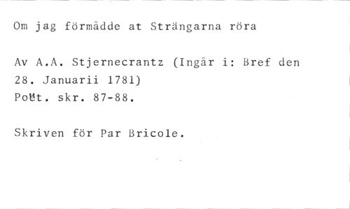 Om jag förmådde at Strängarna röra //// Av A.A. Stjernecrantz (Ingår i: Bref den 28. Januarii 1781) //// Poet. skr. 87-88. //// Skriven för Par Bricole.